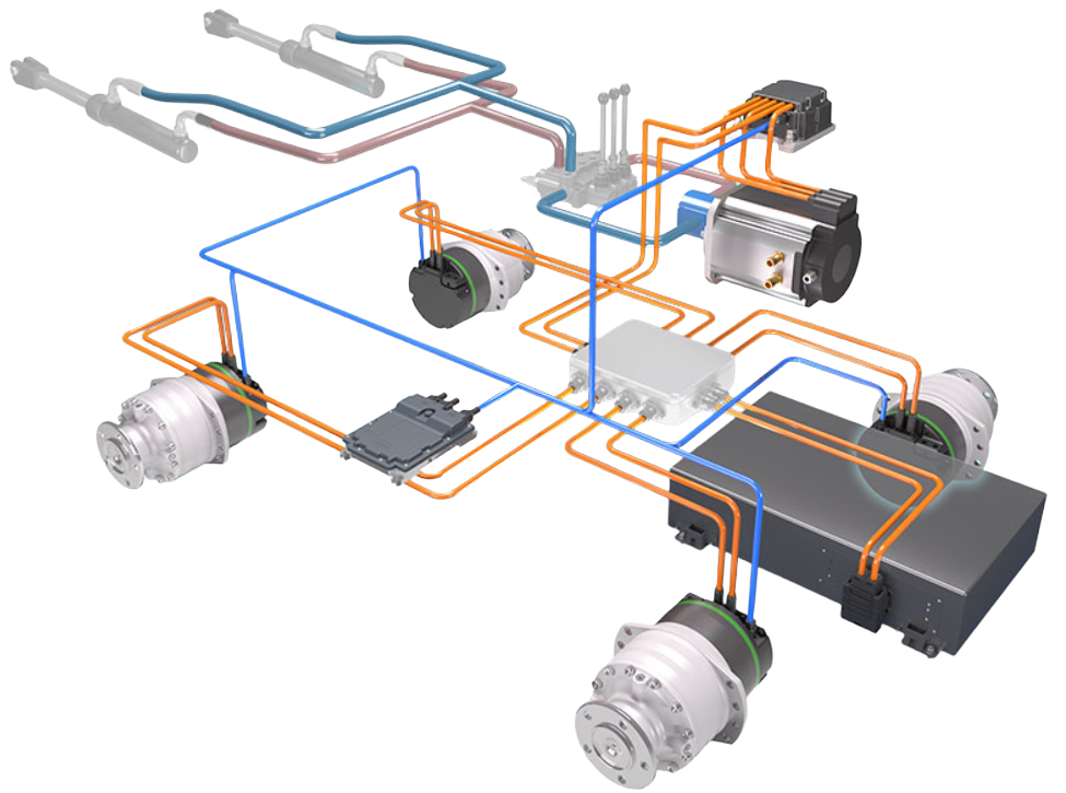 • eHydraulic Power Module: Kompletne rozwiązanie „all-in-one” łączące silnik, inwerter i pompę hydrauliczną (np. D1P) dla funkcji pomocniczych.