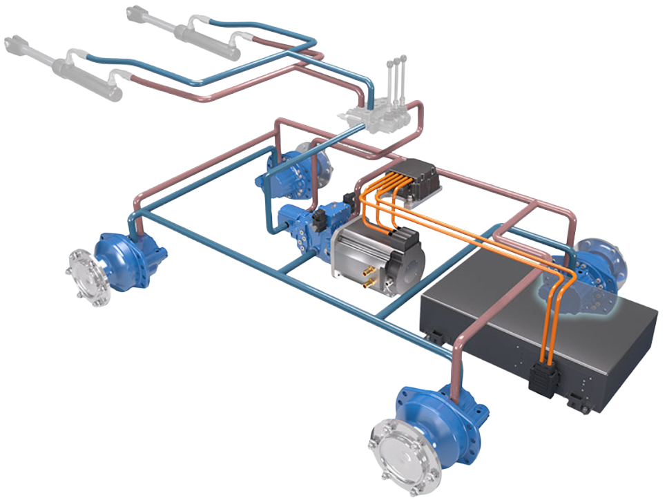 Inteligentny system elektrohydrauliczny (do 150 l/min, 400 bar), to idealne rozwiązanie dla maszyn, które zachowują funkcje robocze oparte na hydraulice, ale chcą wyeliminować silnik spalinowy. Specyfikacja i zastosowanie: