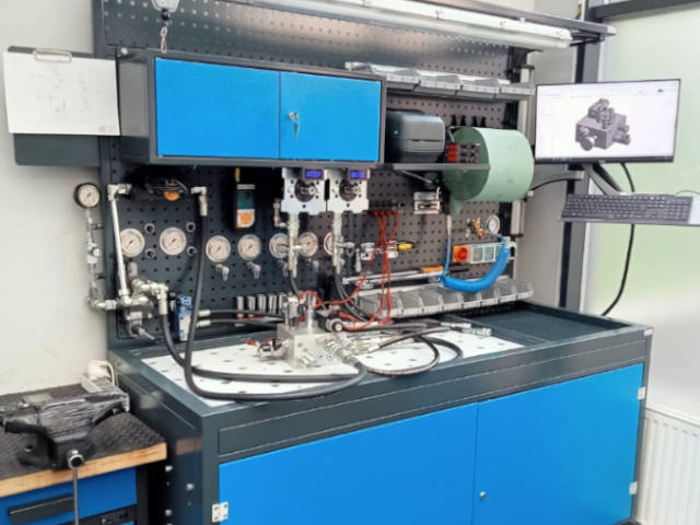Z przyjemnością prezentujemy naszą ostatnią realizację, jaką jest stanowisko montażowo-testowe do specjalizowanych bloków zaworowych hydrauliki siłowej. Stanowisko służy do przeprowadzania badań i precyzyjnych pomiarów parametrów hydraulicznych takich jak natężenie przepływu, ciśnienie oraz opory przepływu, a także pomiaru prędkości obrotowych odbiorników hydraulicznych i funkcjonalności prototypowych układów. Stanowisko wyposażone jest w zespół pompowy stałej, jak i zmiennej wydajności z regulatorem Load Sensing oraz ogranicznikiem mocy i ciśnienia. Stanowisko wyposażone jest również w komputer pozwalający na analizę schematów hydraulicznych oraz przekrojów wewnętrznych projektowanych bloków zaworowych i wizualizację parametrów hydraulicznych.